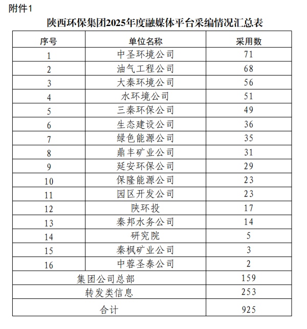 陜西環保集團2025年度融媒體平臺稿件采用及2025年四季度優秀稿件評選情況通報