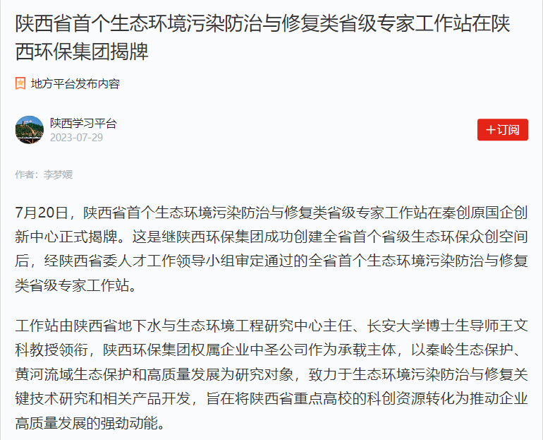 7月29日,學習強國平臺以《陜西省首個生態環境污染防治與修復類省級專家工作站在陜西環保集團揭牌》為題,對陜西環保集團成功創建省級專家工作站等工作開展情況進行了報道,現刊載如下,以饗讀者。