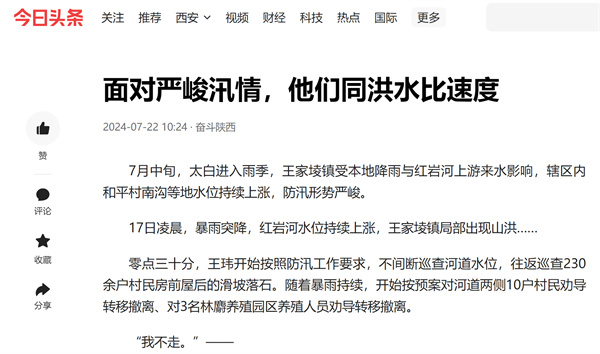 近日,學習強國、陜西日報-群眾新聞網、陽光網、華商二三里等主流媒體對“七下八上”防汛關鍵期以來,陜西環保集團選派掛職干部、駐村工作隊隊員積極服務轄區防汛抗洪等工作情況進行了報道,有力展示了集團職工聞令而動、挺身而出,勇挑重擔、沖鋒在前的良好風貌。現集中刊載如下,以饗讀者。